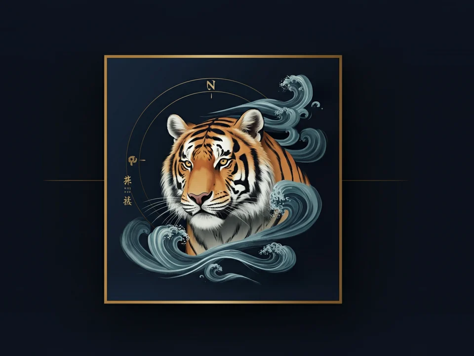 - Tiger raising head: Sharp or pointed features on right—aggressive energy